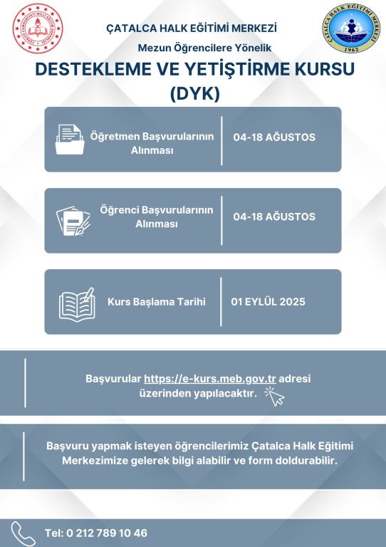 2025-2026 Eğitim ve Öğretim Yılı kapsamında açılacak olan Destekleme ve Yetiştirme Kursları (DYK) için öğretmen ve öğrenci başvuruları başlıyor.